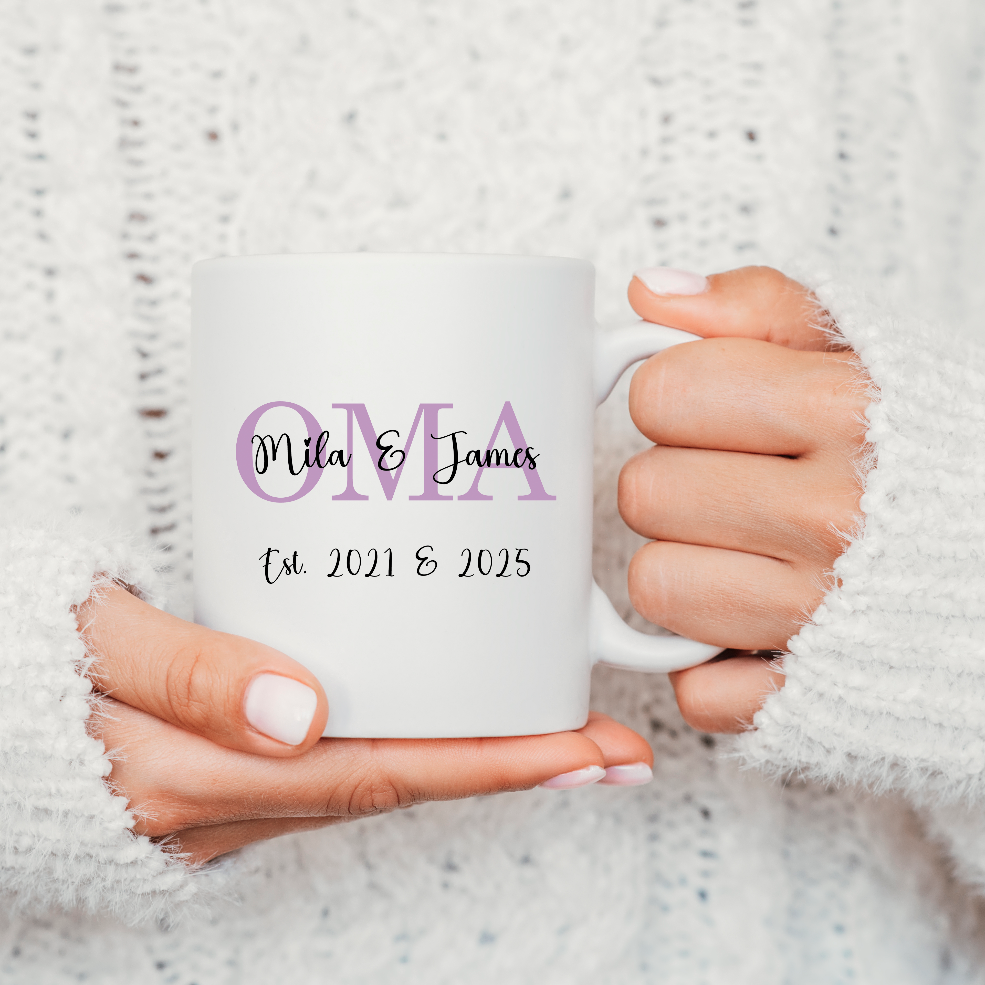 De mok is bedrukt met het woord OMA of OPA in zachte pastelletters en kan worden aangevuld met de namen van de kleinkinderen en hun geboortejaren. Denk aan een lieve combinatie zoals “Mila & James – Est. 2021 & 2025”. Zo wordt elke mok uniek en persoonlijk, precies zoals oma het verdient.