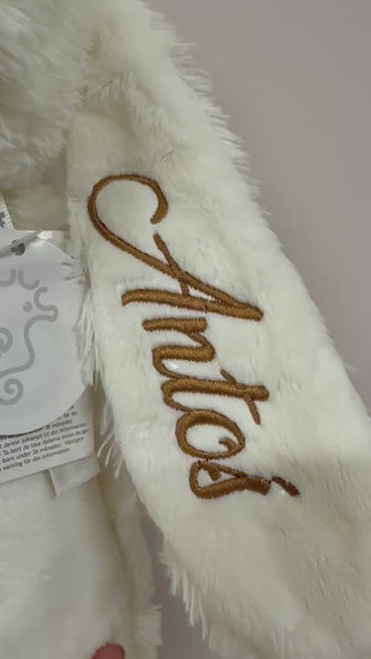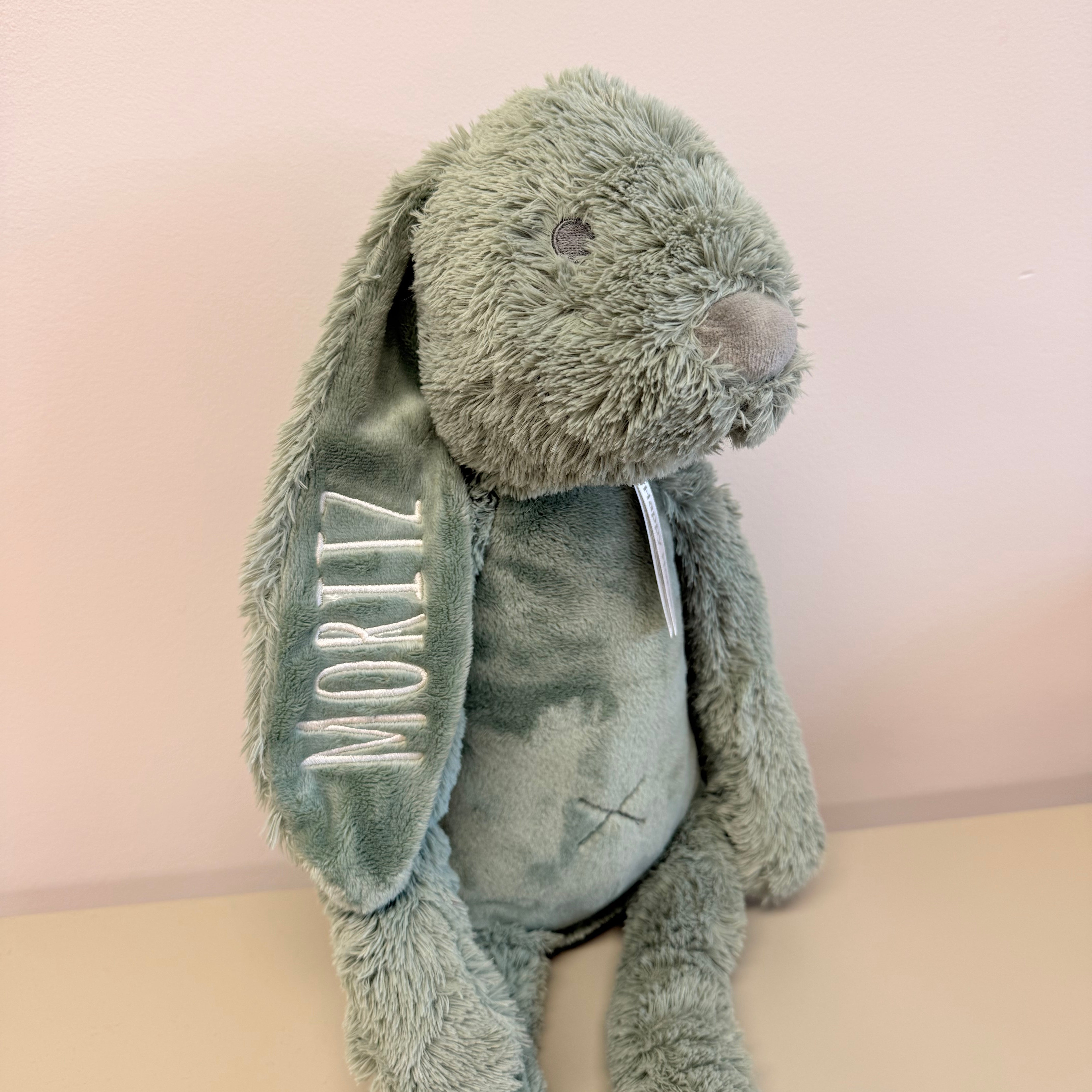 Het oor van het konijn wordt geborduurd. Je kunt zelf kiezen welke tekst je op welk oor wilt laten zetten.