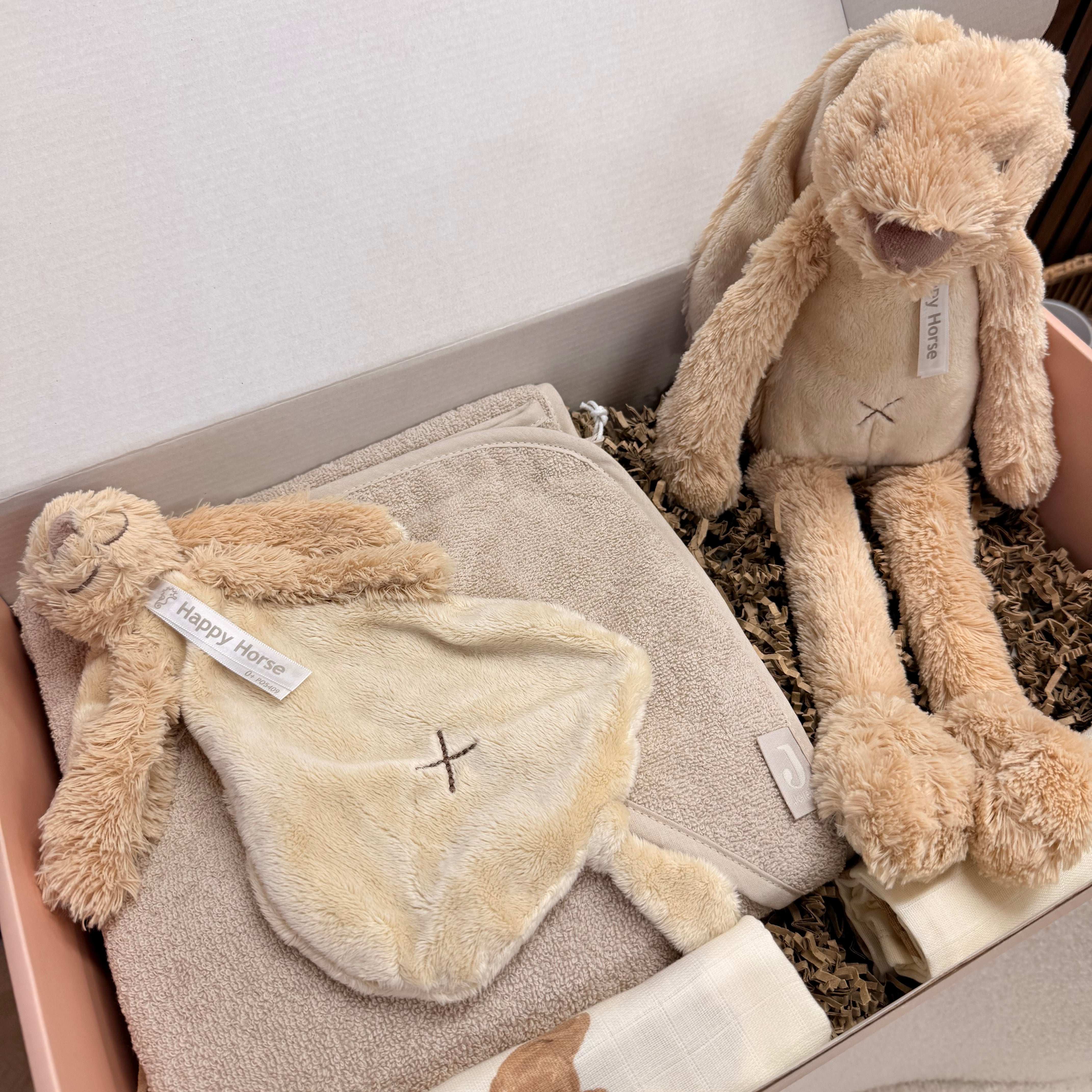 Deze luxe Happy Horse cadeaubox is gevuld met vier geliefde baby-items en wordt prachtig verpakt in een stevige cadeaubox met vloeipapier. Een stijlvol, royaal kraamcadeau dat altijd in de smaak valt. De set bestaat uit een grote Happy Horse Rabbit Richie (38 cm), een zacht tutteldoekje van Happy Horse, een Jollein badcape en twee hydrofiele doeken. Alles past qua kleur en stijl perfect bij elkaar, waardoor het geheel rustig, warm en luxe oogt.