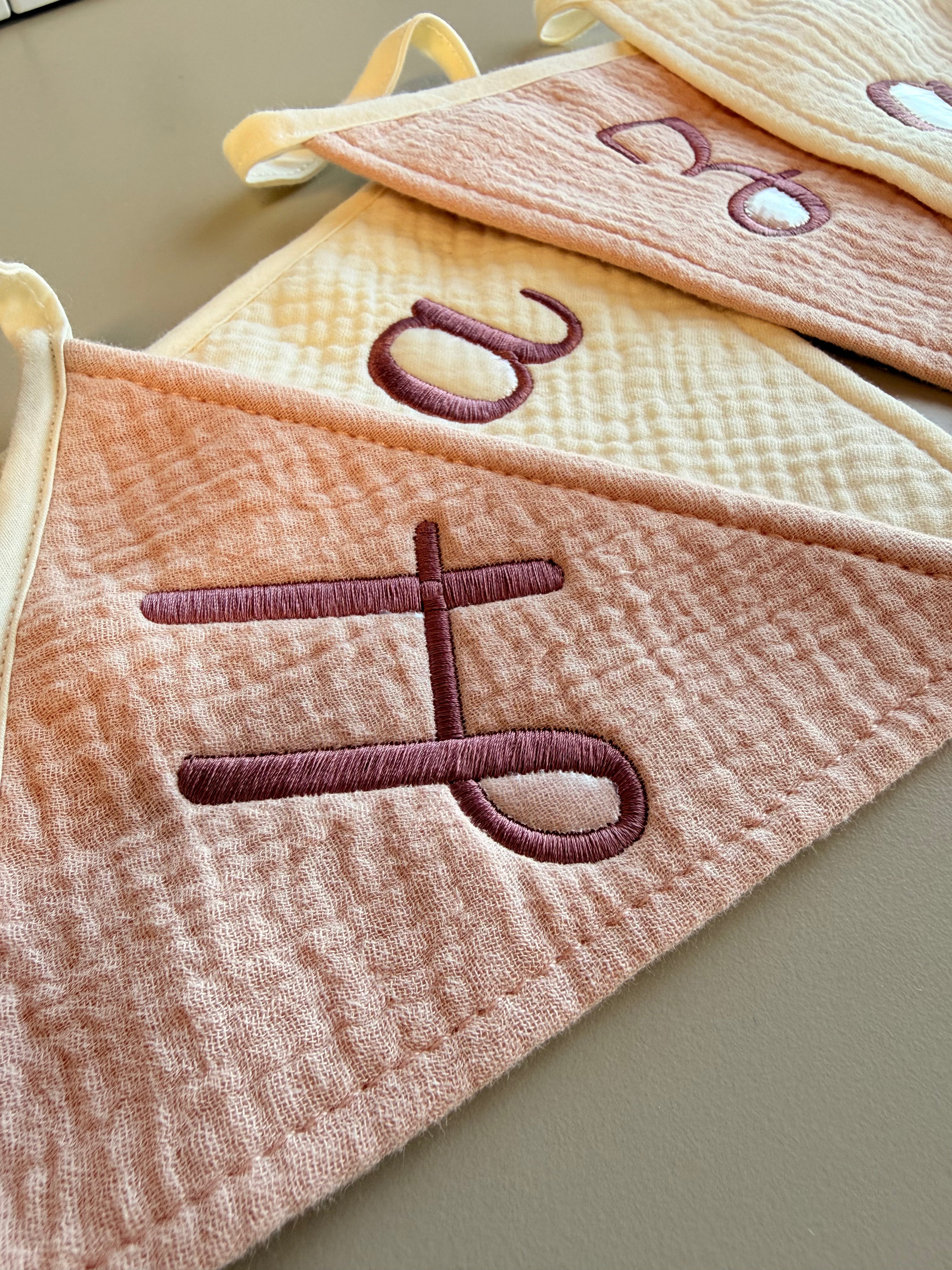 Bij Bkado kun je de vlaggenlijn laten borduren met letters. Zo wordt het een unieke eyecatcher met bijvoorbeeld de naam van je kindje. Standaard is er ruimte voor 6 letters, wil je meer? Neem dan even contact met ons op om de mogelijkheden te bespreken.